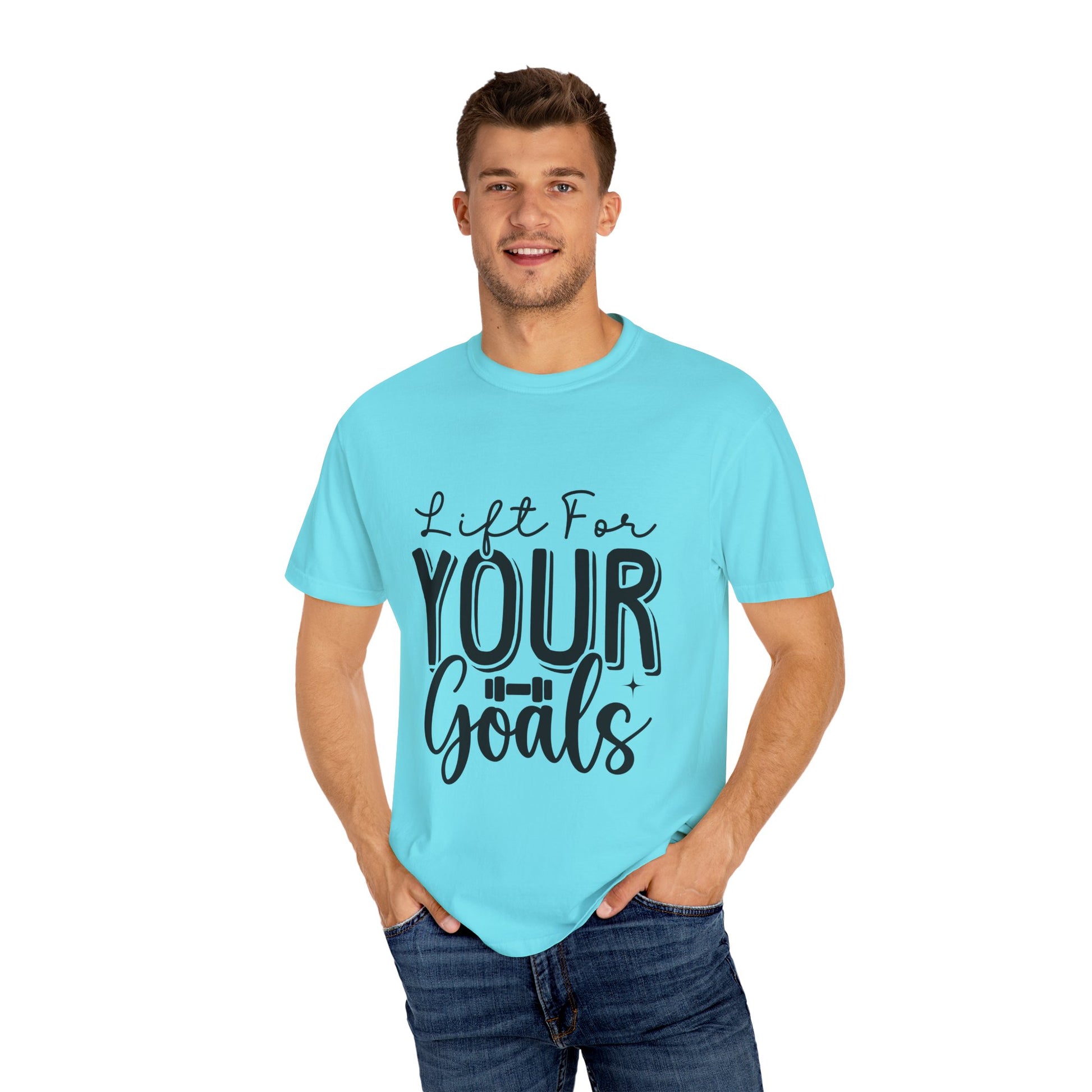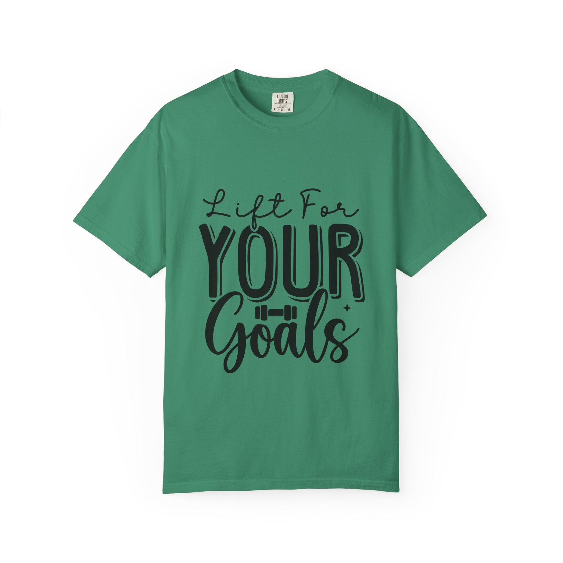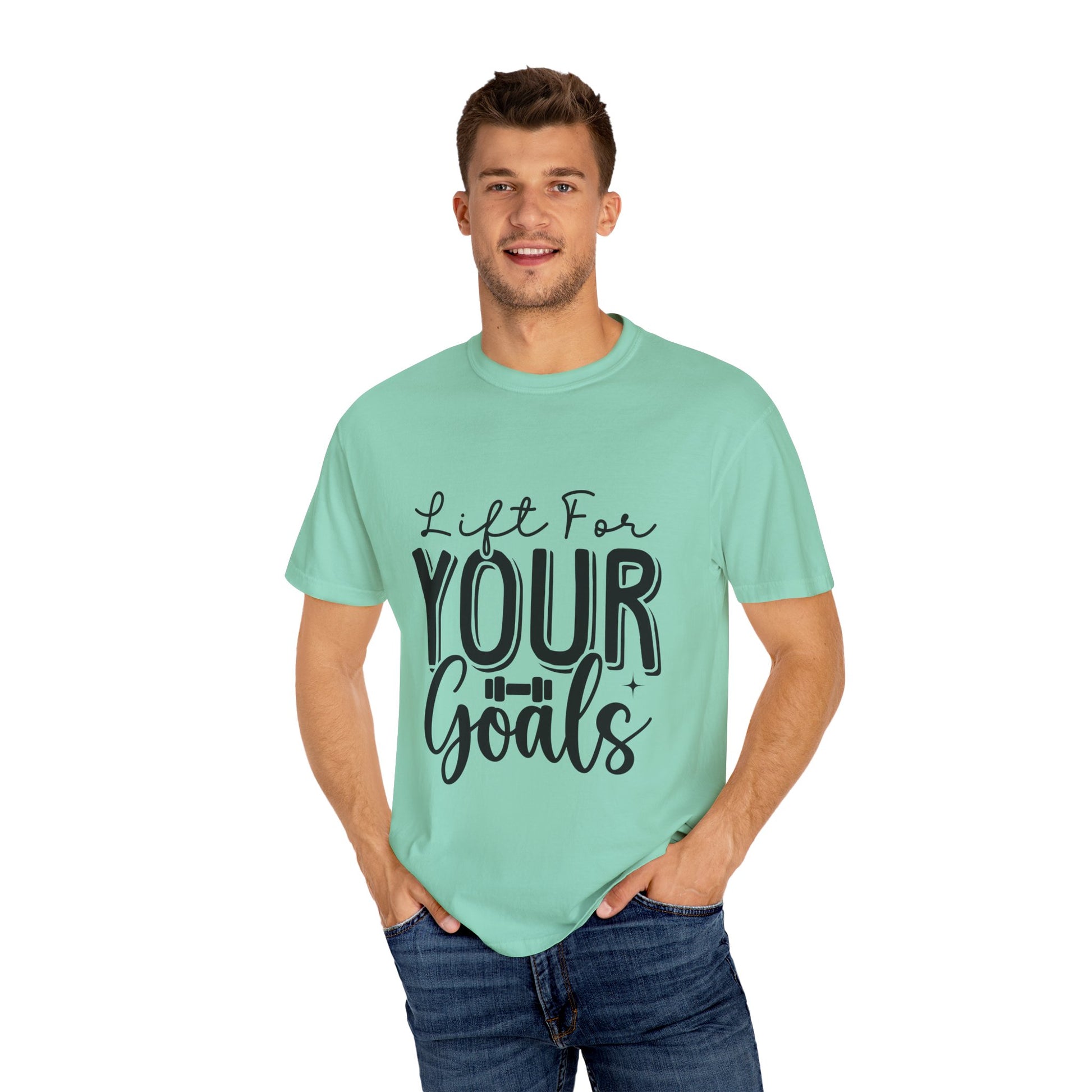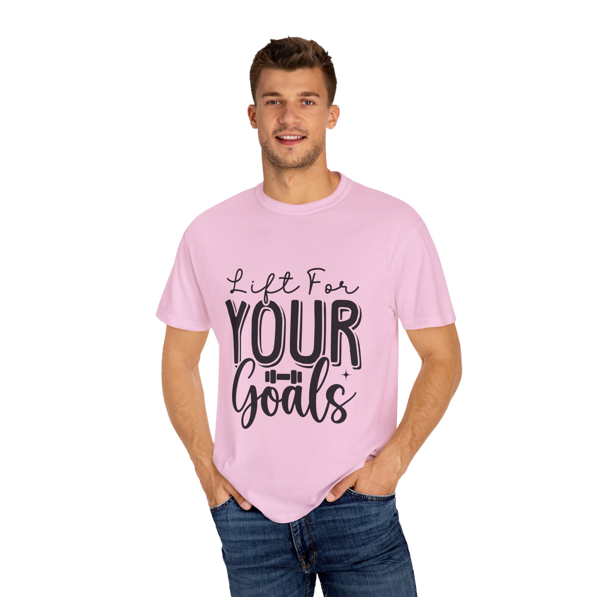 This Unisex Garment-Dyed T-Shirt is an inspirational workout tee with the phrase "Lift for Your Goal". It offers a relaxed fit for comfort in both casual and semi-formal settings. Perfect for fitness enthusiasts and those who love motivational apparel. Ideal for gym-goers, athletes, and anyone who wants a boost of inspiration during their workouts. Great for birthdays, New Year's resolutions, and any fitness-related holidays or events.